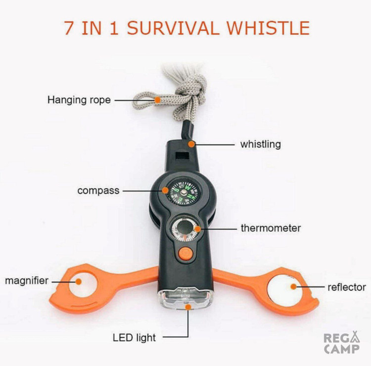 دارای سوت بقا. قطب نما، دماسنج، ذره بین، چراغ قوه ال ای دی، آیینه منعکس کننده نور